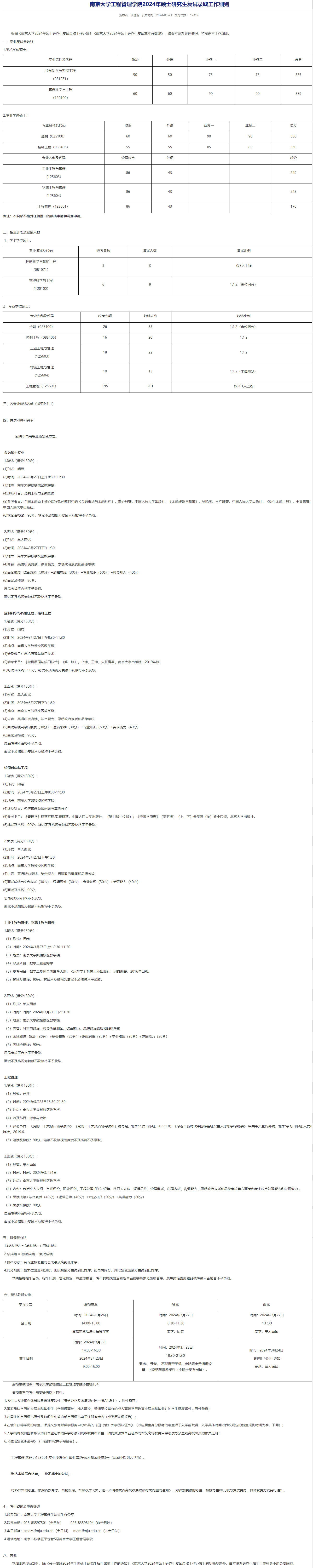2024年南京大学工程管理学院硕士复试细则