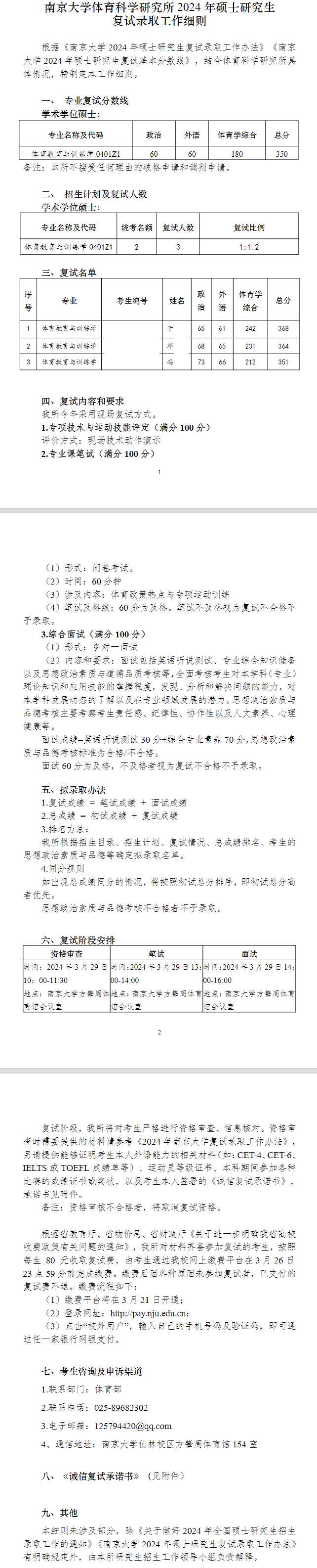 2024年南京大学体育科学研究所硕士复试细则及拟录取名单