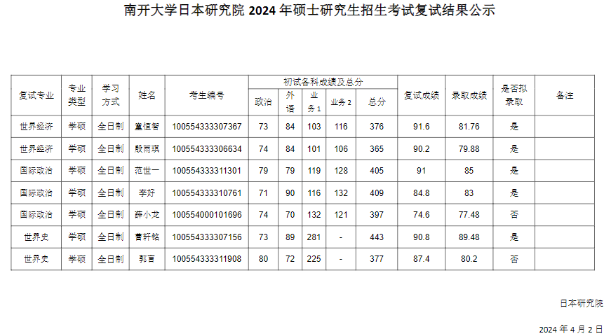 2024年南开大学日本研究院硕士研究生拟录取名单