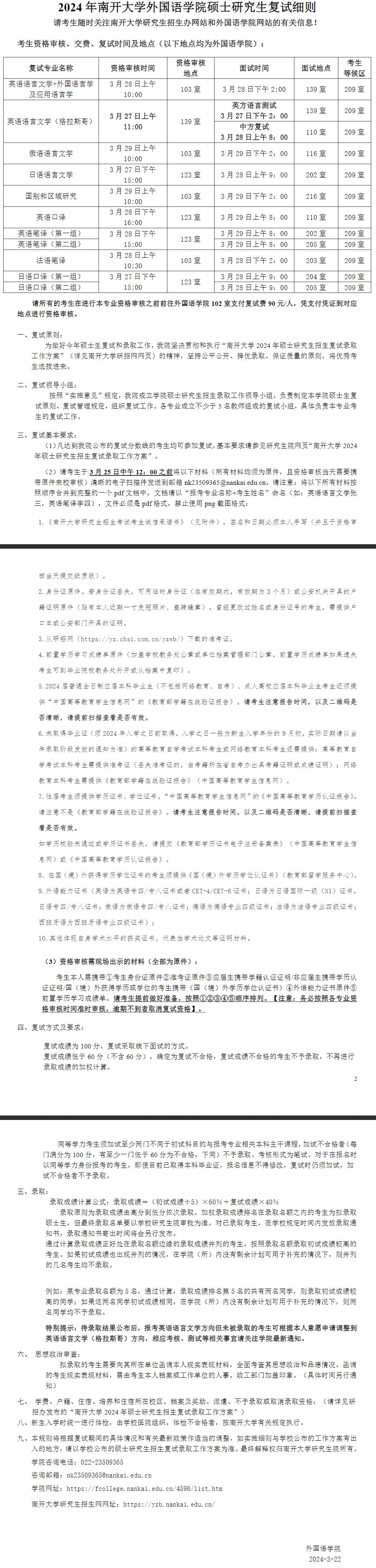 2024年南开大学外国语学院硕士复试细则
