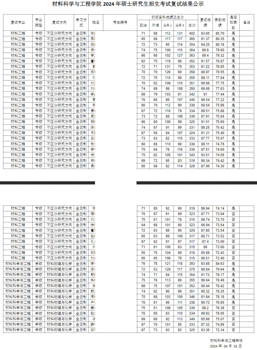 2024年南开大学材料科学与工程学院硕士研究生拟录取名单