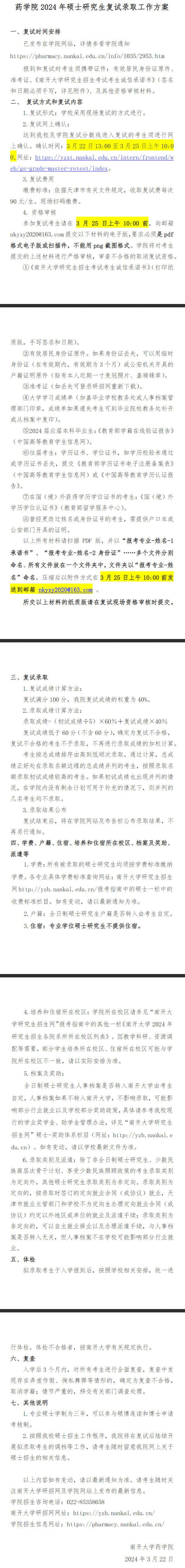 2024年南开大学药学院硕士复试细则