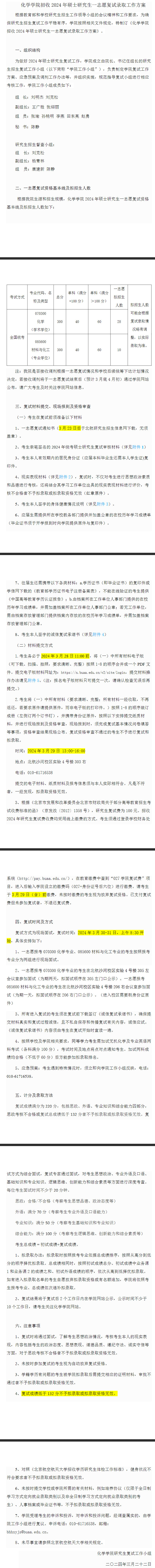 2024年北京航空航天大学化学学院硕士复试分数线及复试细则