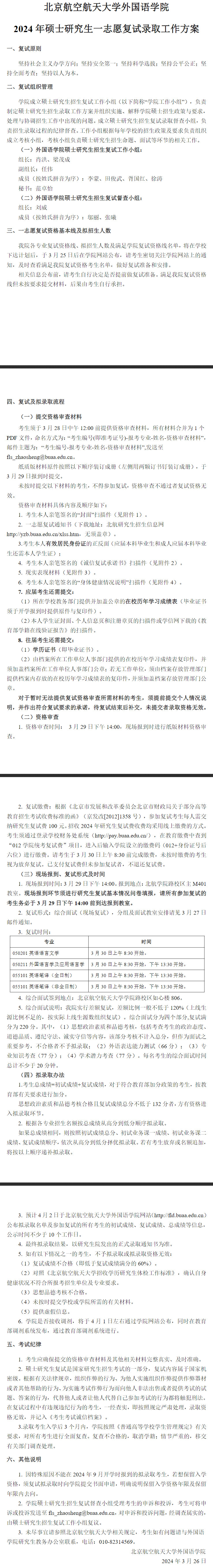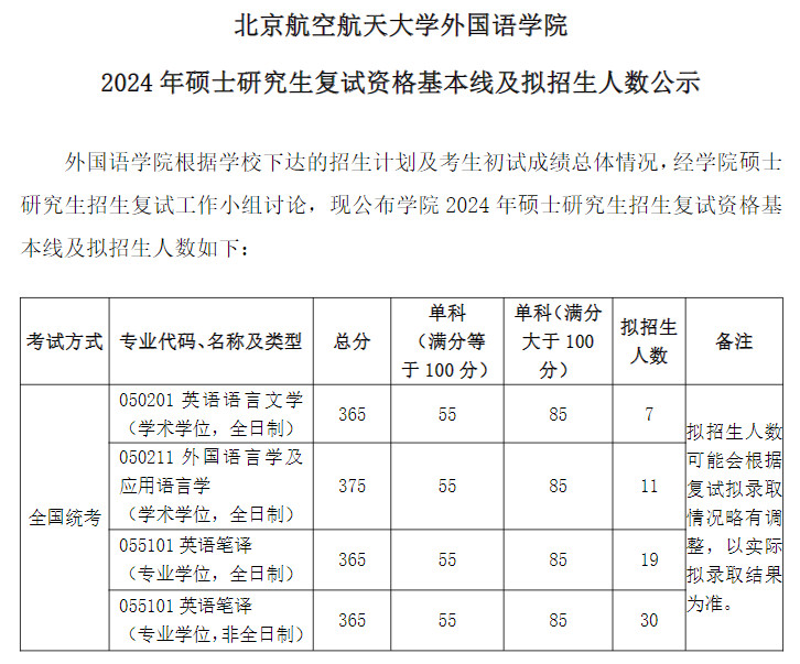 2024年北京航空航天大学外国语学院硕士复试分数线