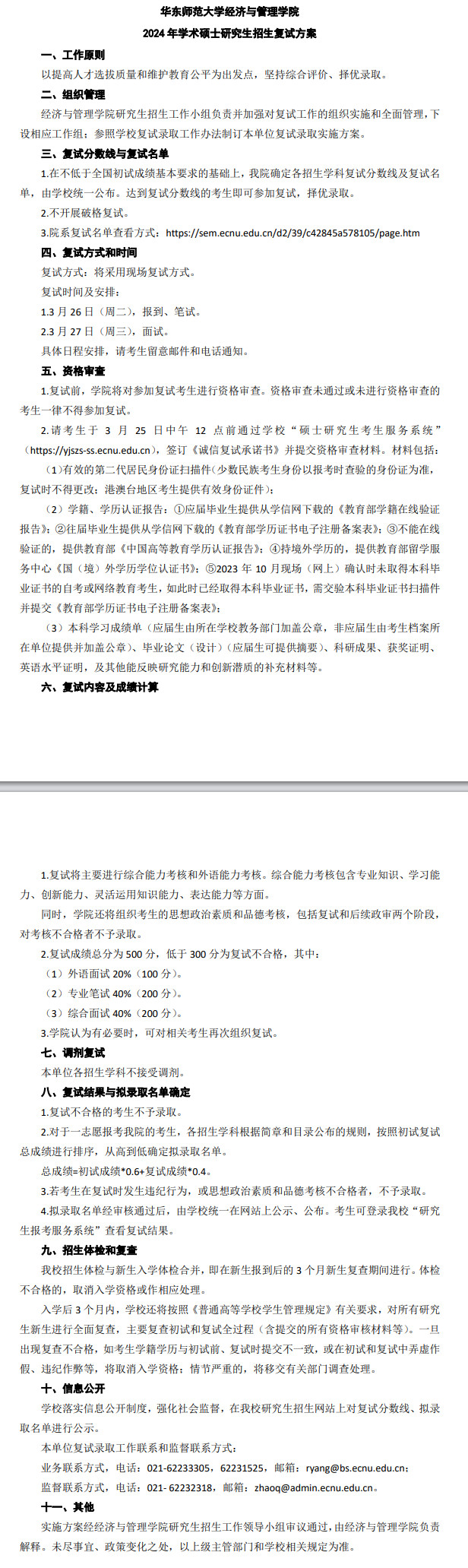 2024年华东师范大学经济与管理学院硕士复试细则