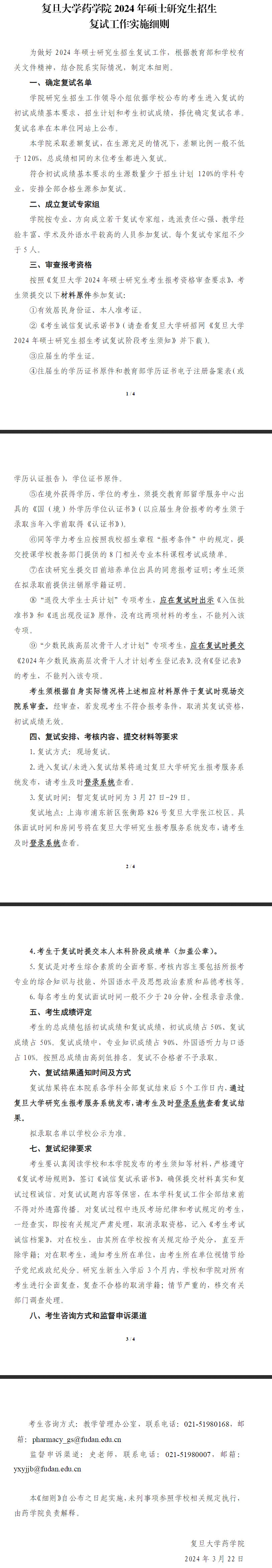 2024年复旦大学药学院硕士复试细则