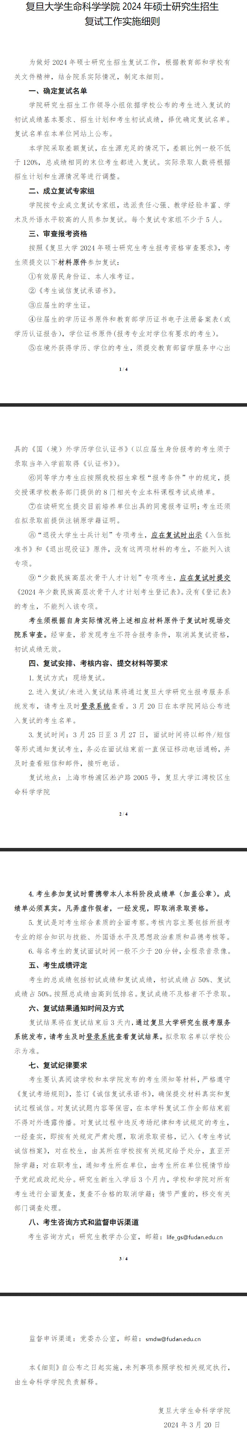 2024年复旦大学生命科学学院硕士复试细则