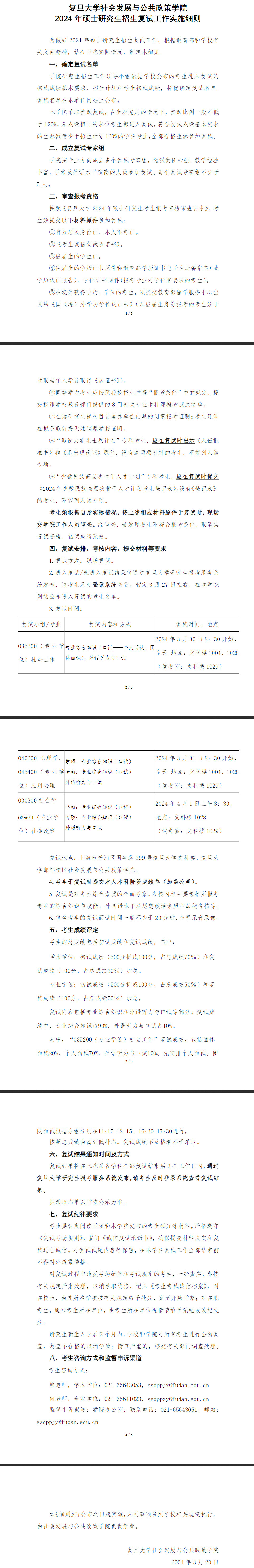 2024年复旦大学社会发展与公共政策学院硕士复试细则