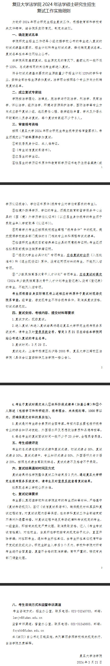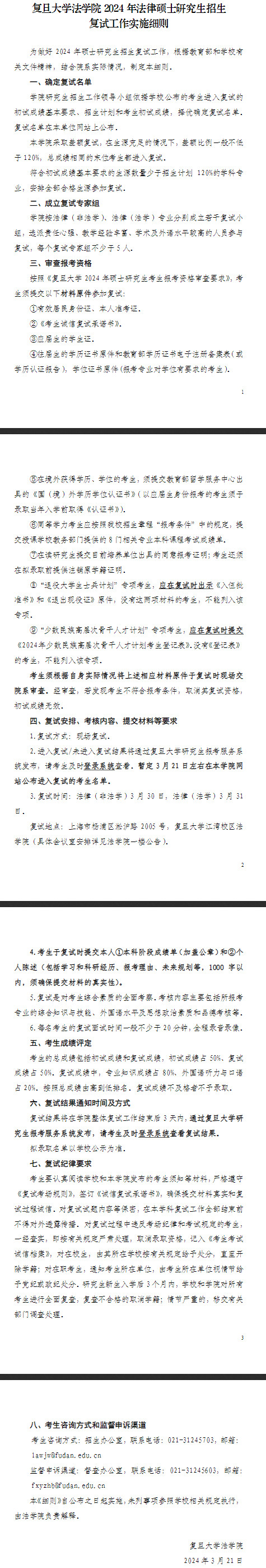 2024年复旦大学法学院法学硕士复试细则