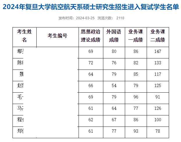 2024年复旦大学航空航天系硕士复试名单