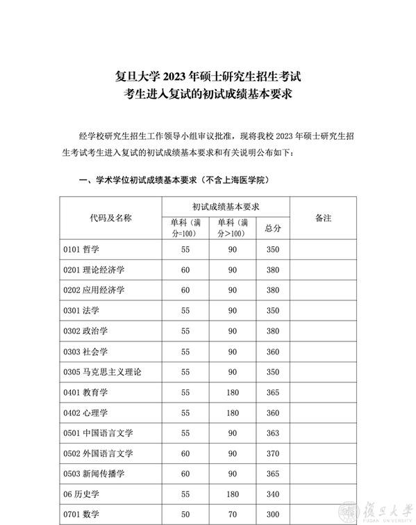 复旦大学2023年硕士生招生考试复试基本分数线公布