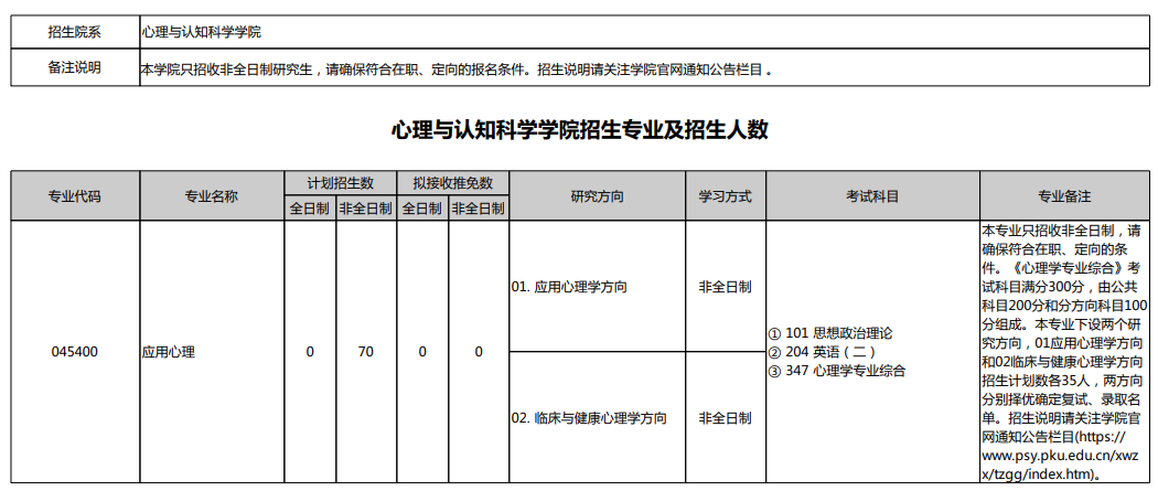 2025年北京大学心理与认知科学学院硕士研究生招生专业目录