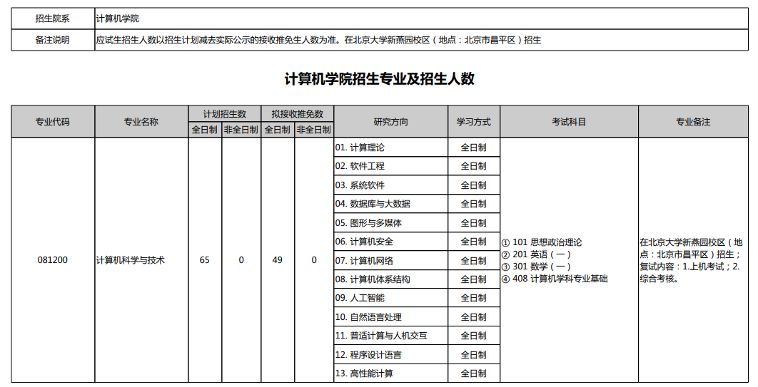 2025年北京大学计算机学院硕士研究生招生专业目录